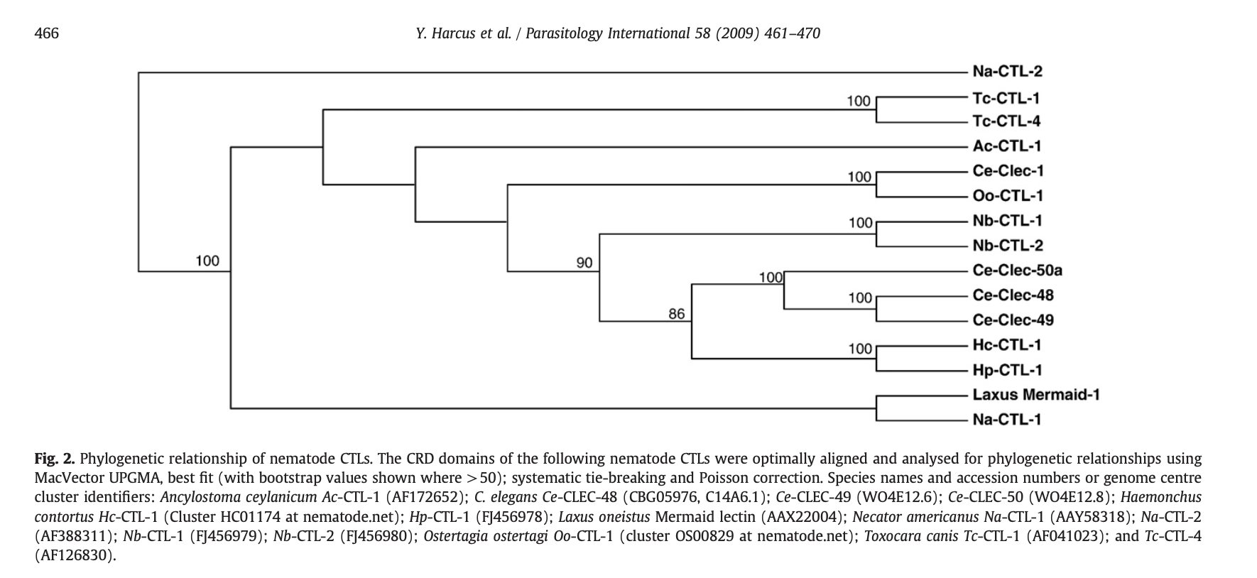 Both Heligmosomoides polygyrus and Nippostrongylus brasiliensis secrete C-type lectins, as described by Harcus et al (2009), with the accompanying phylogenetic tree: