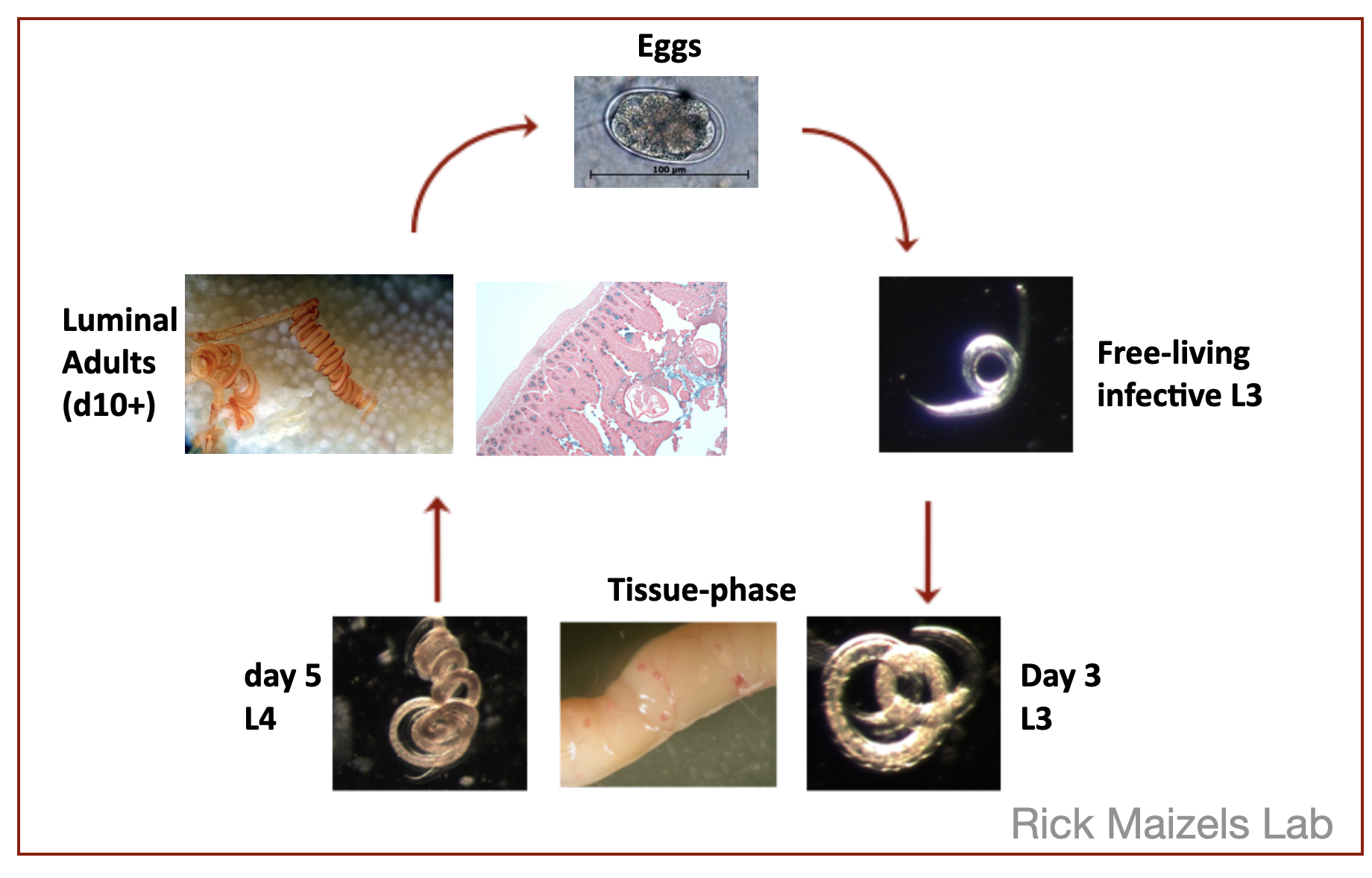 Heligmosomoides polygyrus is a natural nematode parasite of mice. It pursues a direct and entirely enteric life cycle, entering through the mouth and maturing in the intestine to produce eggs which are voided with faeces. It is a valuable laboratory model as it can establish chronic infection in different strains of mice. A detailed description and video of the life cycle and maintenance is available in our open-access Journal of Visualised Experiments article. Additional useful information on the parasite is presented on the H.poly blogspot. General references on the biology and immunology of the parasite include Monroy & Enriquez (1992), Behnke (2009). and Reynolds et al (2012).